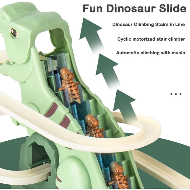 | Features | Motorized climbing stairs, spiral slide rail, lights and music, dual-pulley dino design |