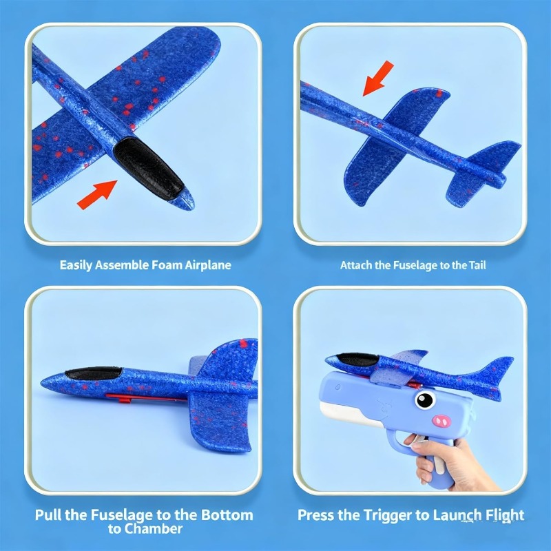 Forget complicated setups. Just slide the wings into place, load the plane onto the launcher rail, pull it all the way back, and press the trigger. The mechanical catapult system sends the foam airplane soaring up to about 10–18 meters, depending on throwing angle and wind conditions. No batteries means less maintenance, more eco-friendly fun, and spontaneous playtime anytime, anywhere.