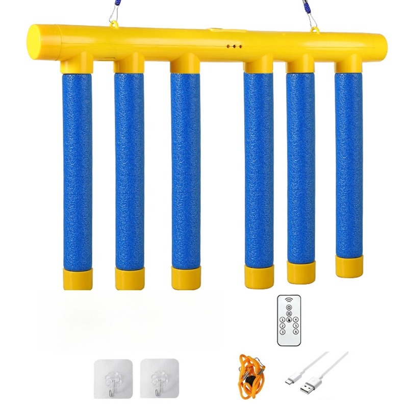 Simply hang the main bar using the included rope and hooks, lightly attach the six sticks to the magnetic grips, and press the power button to start. The built-in rechargeable battery is powered via USB, so you can charge it with a power bank, laptop, or USB adapter—no disposable batteries required.